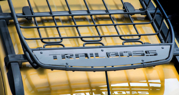 A personalização da Trailboss começou pela pintura da carroceria em amarelo metálico “Summer Jam” e em preto de itens como os para-choques dianteiro e traseiro, o pequeno quebra mato, a barra de iluminação em LED, o santo antônio tubular, o bagageiro e os degraus na traseira que facilitam o acesso à caçamba.