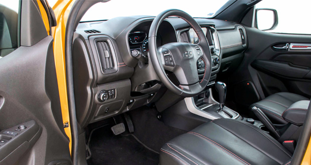 Combinando com o uso da cor preta na parte externa, o habitáculo da Trailboss recebeu revestimento de teto na mesma cor, estendida aos bancos, painel, apoio de braços e volante revestidos em couro com costura pespontada na cor laranja.