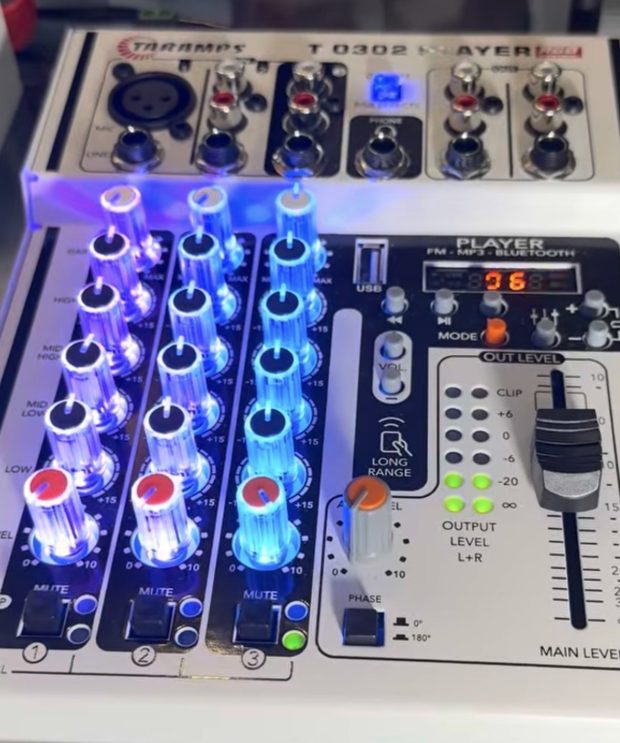 A tradicional marca Taramps trouxe para o ENAN a mesa T-302 com três canais que já tinha os efeitos de iluminação RGB e conexão Bluetooth, USB e agora saída para fita de Led e estrobo.