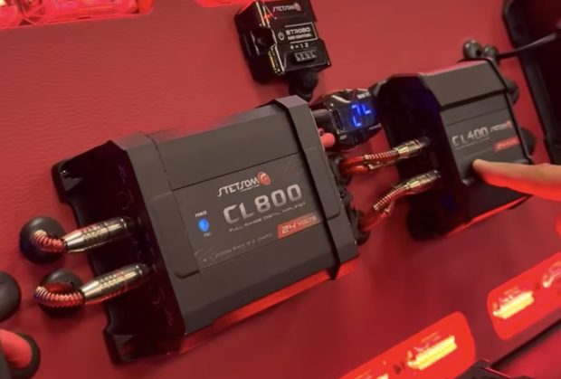 A STETSOM também diversificou sua linha de fontes e amplificadores com várias novidades. Na linha 24V para veículos pesados, a CL800 e CL400 são as principais novidades. Também foram apresentados os novos barramentos com proteção em nylon permitindo uma instalação de som mais isolada e segura (disponível nas cores vermelho e preto).